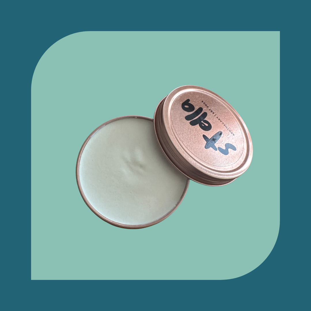 Ingredients: Shea butter, coconut oil, olive oil, Kaolin, Magnesium hydroxide, arrowroot powder, spearmint, peppermint, eucalyptus essential oils.